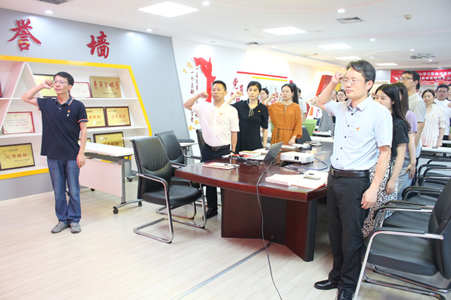 為慶祝(zhù)中(zhōng)國共產黨成立102周年,弘揚偉大(dà)建黨精神(shén),全體黨員在第五黨支部書記(jì)解庭波同誌的帶領下,麵向黨旗,莊嚴宣誓,在入黨誓詞中堅定理想信念,不(bú)斷叩問初心、守護(hù)初心,把對黨忠誠的(de)錚錚誓言貫穿工作各方(fāng)麵、全過程。