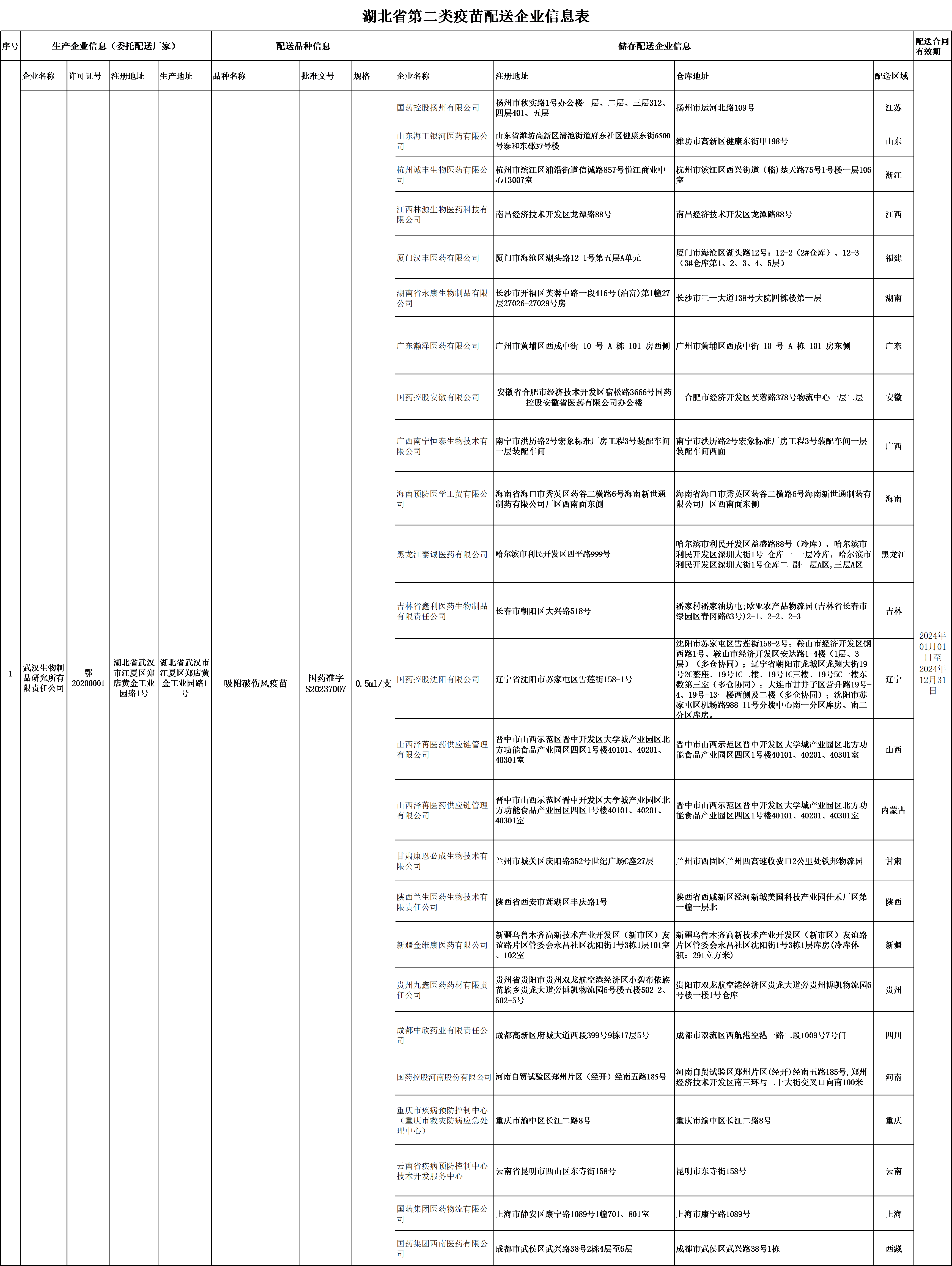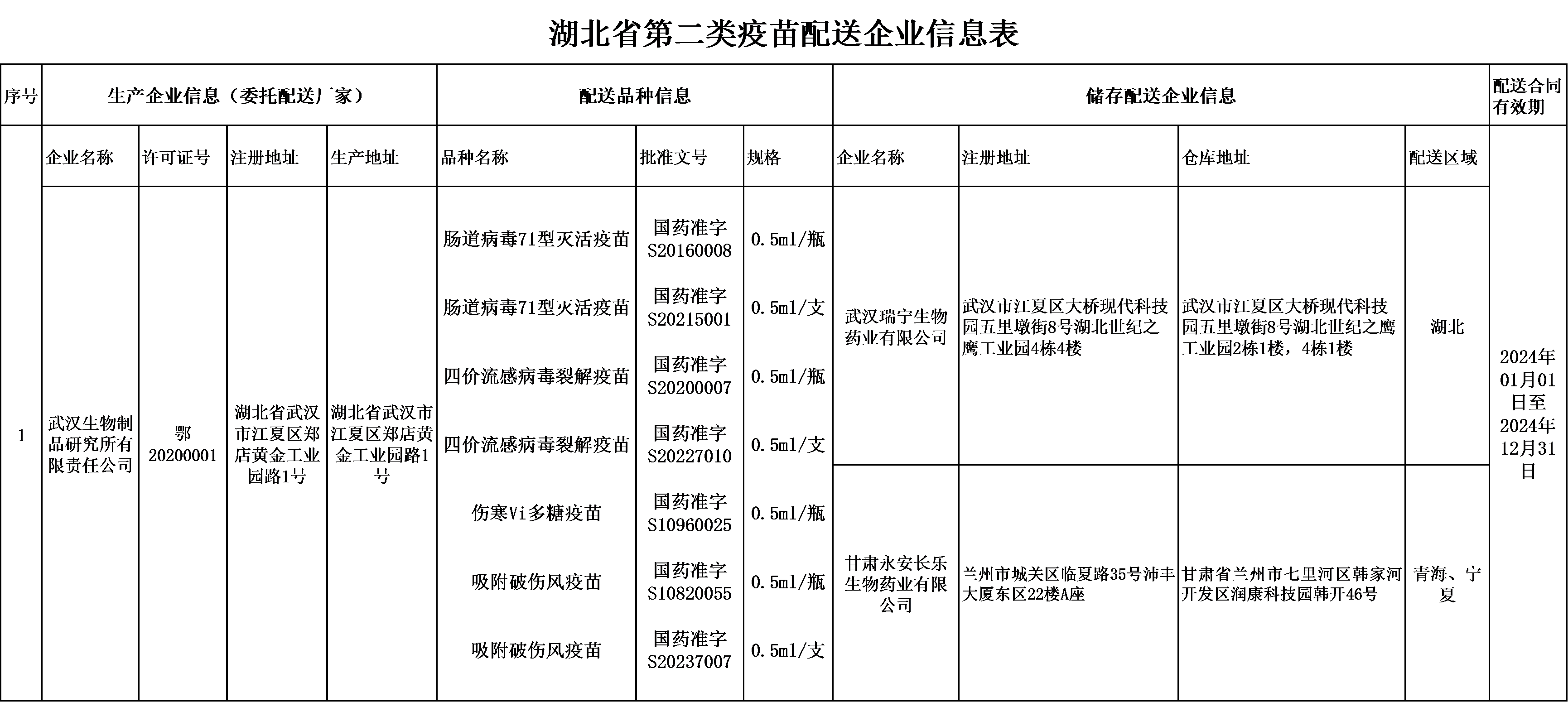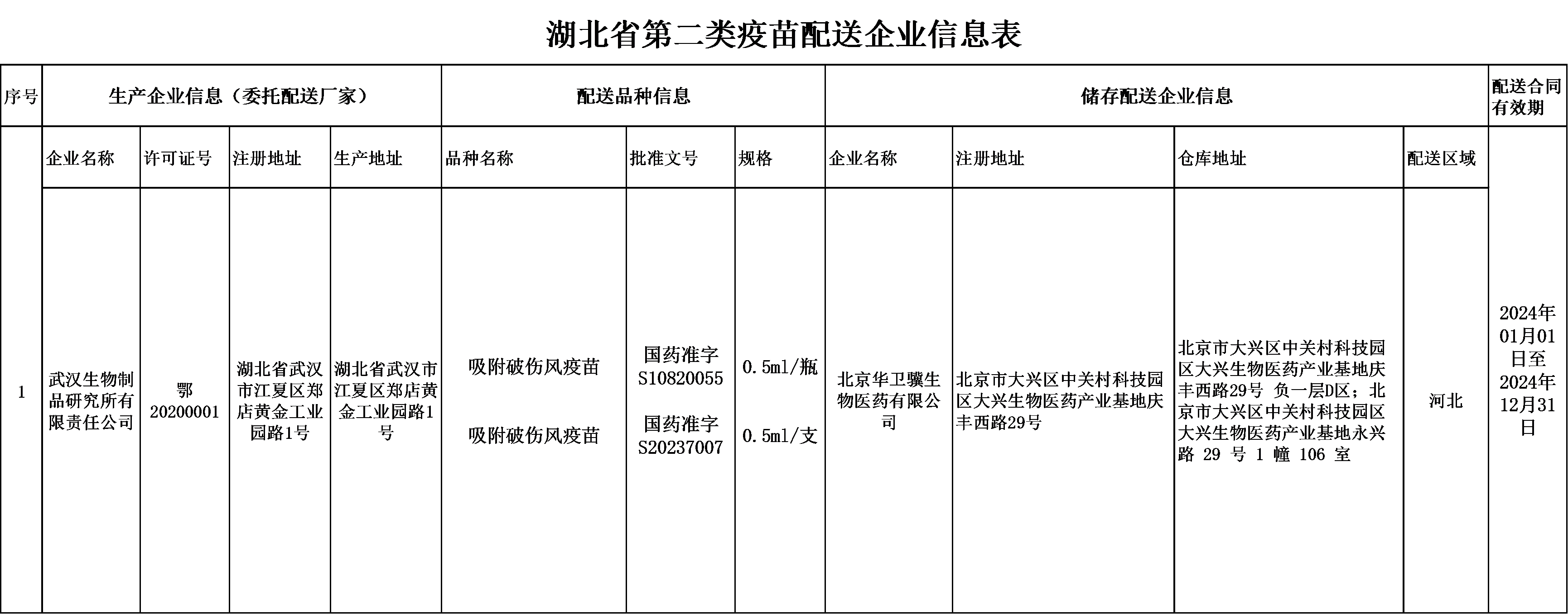 湖北省第二類疫苗配送企業信(xìn)息表(biǎo)(羞羞视频在线生物製(zhì)品研(yán)究所有限責任公司)
